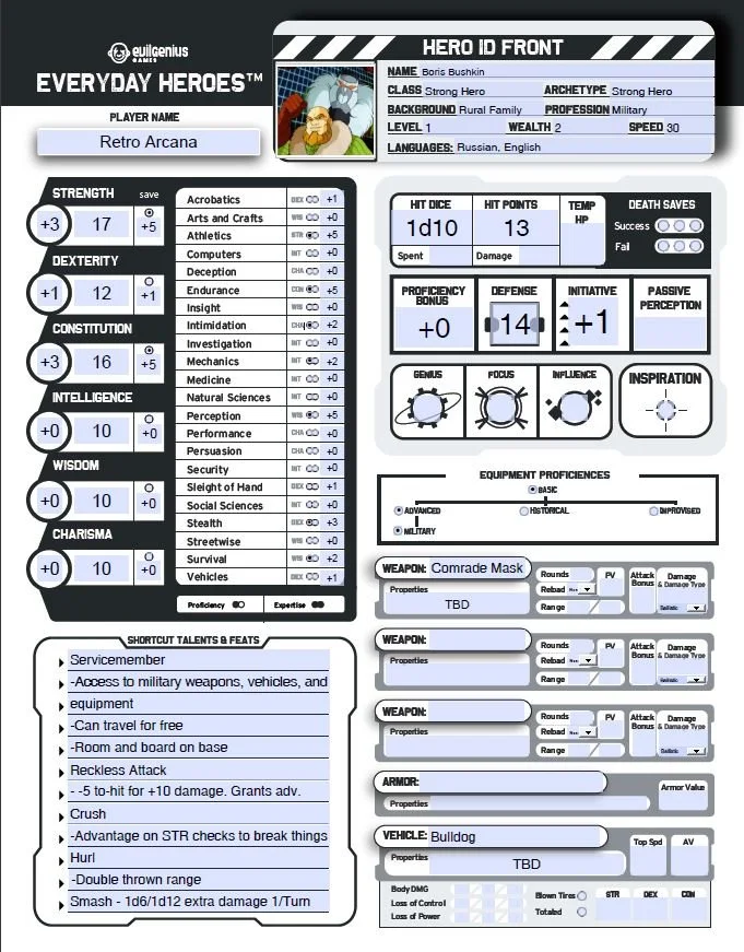 Boris Bushkin is a Strong Hero. He gets a d10 Hit Die, his Defense is based on STR, and comes out to 14. He gets the Reckless Attack ability, which allows him to take a -5 to-hit in exchange for +10 damage. This comes at the side effect of granting enemies advantage to attack him in return. We give Boris the Brawler Class. STR and CON are proficient saves. He picks up Endurance and Intimidation. He already has proficiency in Basic and Advanced equipment, so nothing changes there. He gets the “Badass Pack” as a piece of equipment. Yes, that’s seriously a thing in Everyday Heroes.