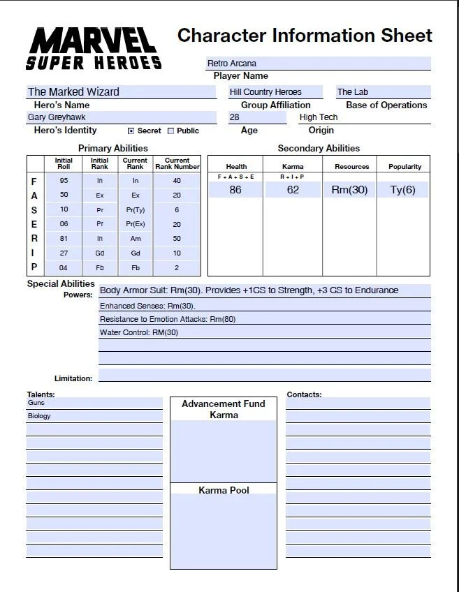 Does the hero have a secret identity? How do they keep it secret? So, The Marked Wizard is the alter-ego of Biology Major and roleplaying game nerd Gary Greyhawk. Gary was a brilliant student, and doing well in college until he was unexpectedly stricken by a heart malady that required severe and invasive surgery. Surviving the surgery, Gary found that he was among the patients who suffered from post-traumatic stress as a result of the operation. As his recovery slowly proceeded, he met two important people. His therapist, and fellow student Kaylee King. The former helped him begin to deal with his trauma, and focus himself on his recovery. This led to his work on an emotional shielding device, which he co-invented with Kaylee King, inadvertently learning of her armored suit project. He lent his biological expertise to the suit’s animal transformation software, and in turn King helped him build his own suit to allow them to team up. Gary, an avid player of spellcasters, modeled his suit on something reminiscent of wizard, and used the molecular control system that allowed King’s suit to transform to allow his suit to control nearby volumes of water. As The Marked Wizard, Gary “conjures” objects made of water to do his bidding. He adventures during the off-hours with the rest of his team, making sure to keep up his appearances in classes and labs. He’s the oldest member of the Hill Country Heroes, due to his long recovery time and the fact that he’s a graduate student working on his Ph.D.